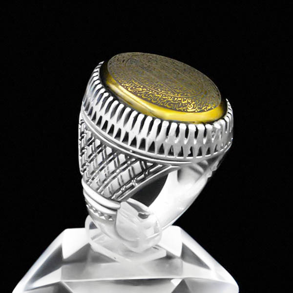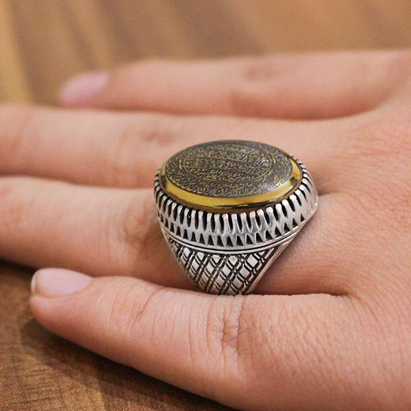 انگشتر حدید صینی طرح آیت الکرسی از رکابی بسیار مقاوم و با استحکام ساخته شده است که با طراحی بسیار دلنشین و زیبا و از نقره ۹۲۵ عیار اصل ساخته شده است. نگین این محصول به صورت تخت روی رکاب آن سوار شده است و روی نگین آن بسیار زیبا و با دقت آیه کامل آیت الکرسی حکاکی لیزری شده است. این حکاکی بسیر ظریف و زیبا انجام شده و خواص بسیاری برای آن در کتب اسلامی ذکر شده است. جنس نگین حدید صینی معدنی است که برای آن خواص زیادی ذکر شده است. این انگشتر طراحی منحصر به فردی دارد و قابل سایز شدن برای هر سایزی میباشد.
