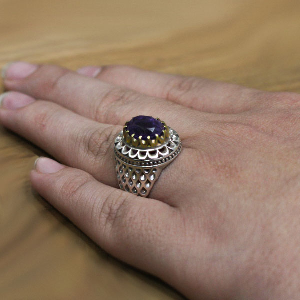 انگشتر نقره مردانه فاخر با سنگ آمیتیست الماس تراش طرح دورطلایی دوستار