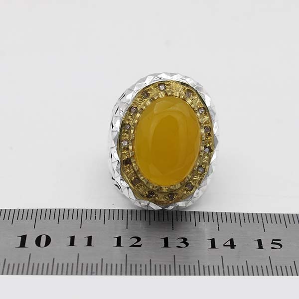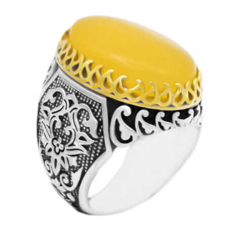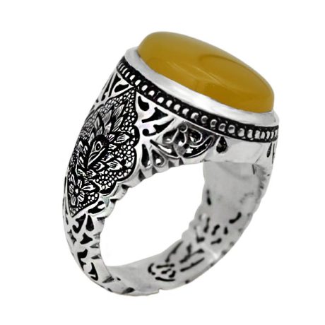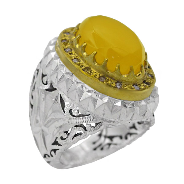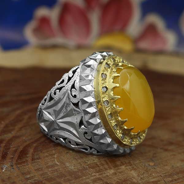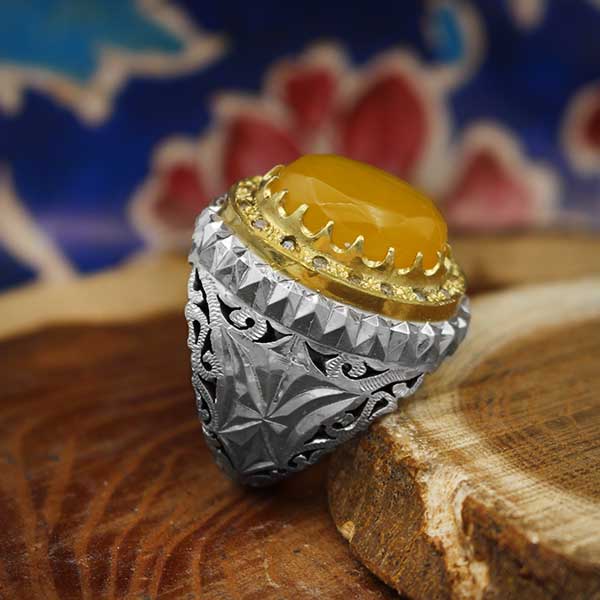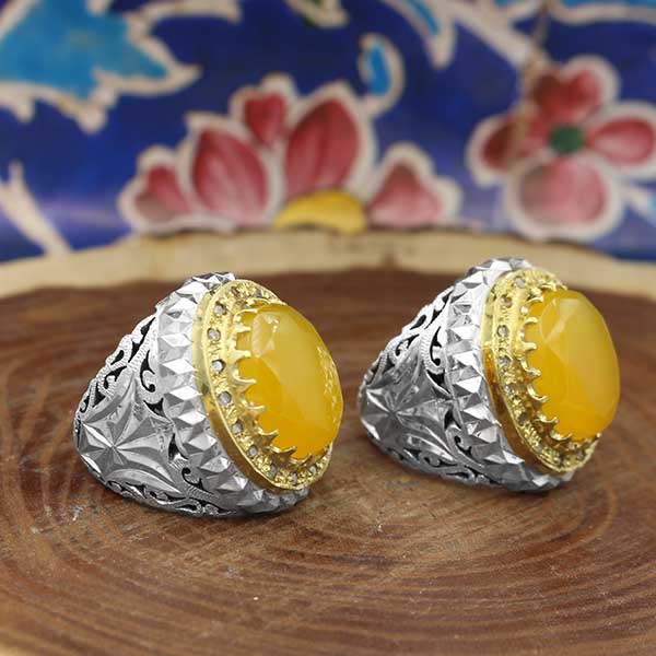 بر روی این محصول در دور نگین 15 قطعه برلیان مخراج کاری شده است که باعث شده است این اثر هنری جلوه لوکس داشته باشد. مخراج های این انگشتر برلیان اصل و معدنی است و کیفیت مناسبی دارند. نگین های برلیان این انگشتر سایز درشت و کیفیت مناسبی دارند که ارزش این انگشتر فاخر را افزایش داده اند. تاج این انگشتر از جنس برنج بوده و رنگ طلایی آن در استفاده طولانی مدت به هیچ وجه تغییر نمی کند. طرح شبکه روی بازوهای این انگشتر بسیار ظریف و با دقت اجرا شده است. همچنین از آیینه کاری در دور نگین به زیبایی استفاده شده است و بر روی بازوی انگشتر نیز آیینه کاری بسیار درخشان و بی نقص اجرا شده است. شبکه و آیینه کاری سه بعدی این رکاب توسط یکی از حرفه ای ترین سازندگان مشهدی ساخته شده که کیفیت آن بسیار مناسب ارزیابی می شود. نگین این انگشتر عقیق شرف الشمس اصل است که برای آن در کتب اسلامی خواص بسیاری ذکر شده است (حکاکی ذکر پر فضیلت شرف شمس در پشت نگین با آداب معین و در زمان خاص). نگین به صورت الماس تراش است و زیبایی و جلوه مناسبی به انگشتر داده است.