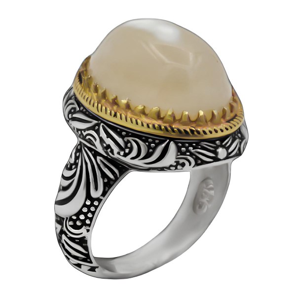 انگشتر عقیق باباقوری مردانه طرح جاهد از نقره ۹۲۵ عیار ساخته شده است. رکاب این انگشتر درخشان و صیقلی بوده و از ظرافت و استحکام بالایی برخوردار است و نگین با کیفیت مناسبی به روی آن سوار شده است. قسمت طلایی رنگ و چنگ انگشتر از برنج ساخته شده و تغییر رنگ نمیدهد و جلوه بسیاری به آن بخشیده است. جنس نگین سنگ عقیق سلیمانی اصل و معدنی است که خواص معنوی فراوانی دارد و رنگی سفید و کمی کرمی دارد و لایه لایه و جذاب است. همچنین در بالای این سنگ طرحی شبیه به چشم وجود دارد که به همین دلیل به این سنگ باباقوری نیز گفته میشود. عقیق از محبوب ترین گوهرهاست و از جانب پیامبر مکرم اسلام (ص) بسیار توصیه شده است. این انگشتر قابلیت سایز شدن برای هر سایز انگشتی را دارد.