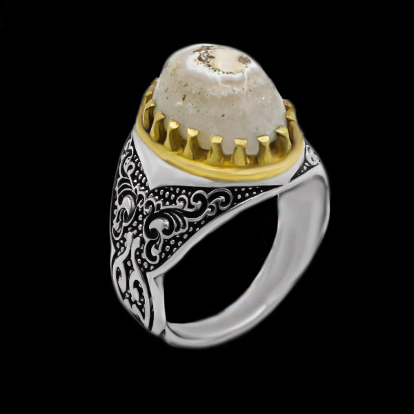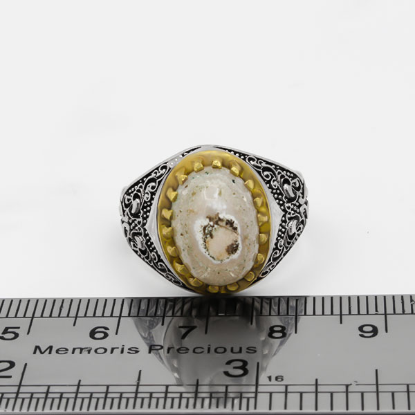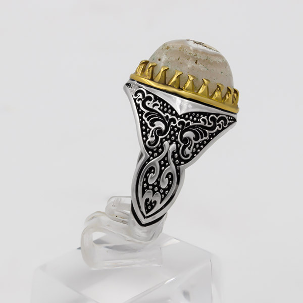 انگشتر عقیق باباقوری مردانه طرح پیام از نقره ۹۲۵ عیار ساخته شده است. رکاب این انگشتر درخشان و صیقلی بوده و از ظرافت و استحکام بالایی برخوردار است و نگین با کیفیت مناسبی به روی آن سوار شده است. قسمت طلایی رنگ و چنگ انگشتر از برنج ساخته شده و تغییر رنگ نمیدهد و جلوه بسیاری به آن بخشیده است. جنس نگین سنگ عقیق سلیمانی اصل و معدنی است که خواص معنوی فراوانی دارد و رنگی سفید و کمی کرمی دارد و لایه لایه و جذاب است. همچنین در بالای این سنگ طرحی شبیه به چشم وجود دارد که به همین دلیل به این سنگ باباقوری نیز گفته میشود. عقیق از محبوب ترین گوهرهاست و از جانب پیامبر مکرم اسلام (ص) بسیار توصیه شده است. این انگشتر قابلیت سایز شدن برای هر سایز انگشتی را دارد.