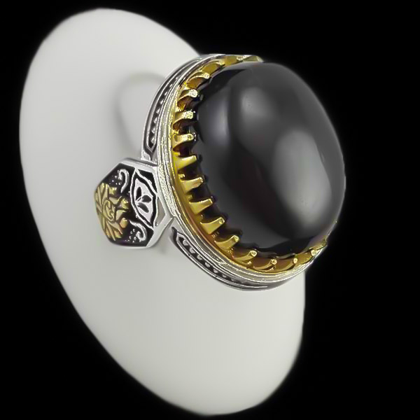 انگشتر عقیق مشکی نقره مردانه طرح دورطلایی بهتاش