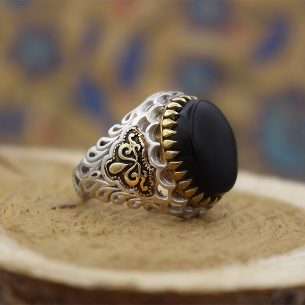 انگشتر عقیق مشکی نقره مردانه طرح دور طلایی ارشک
