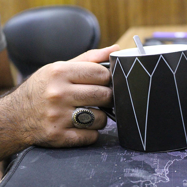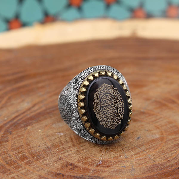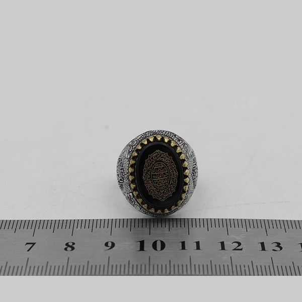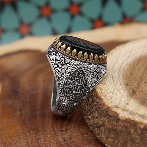 بر یک طرف این انگشتر عبارت زیبای “یا انیس النفوس” و در طرف دیگر عبارت “یا شمس الشموس” به صورت لیزری با کیفیت بسیار بالا حکاکی شده است. طرح های قلم زنی این انگشتر دست ساز است و به دست یکی از هنرمندان حرفه ای مشهدی انجام شده است.