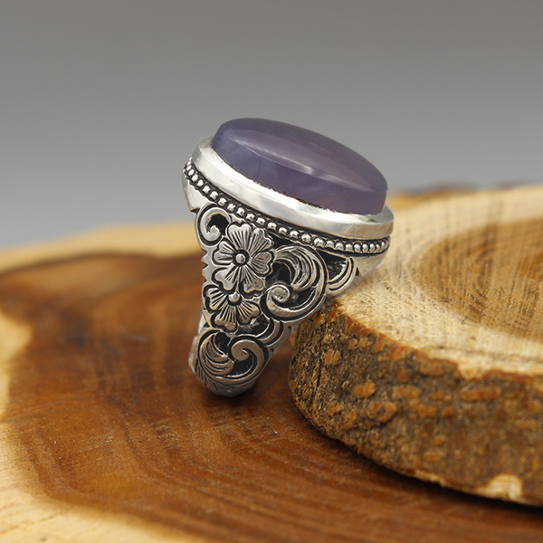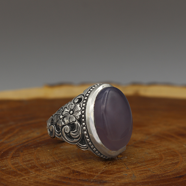 انگشتر عقیق کبود یمنی نقره مردانه دست ساز طرح قلم زنی پویا