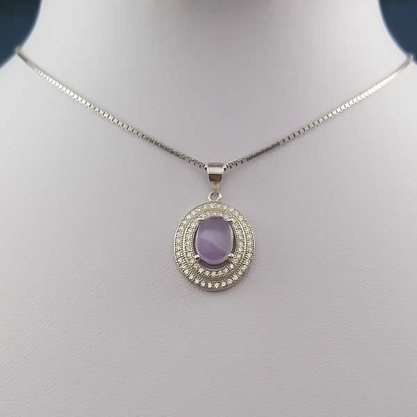 گردنبندی پر از نگین های ریز سوئیسی درخشان که این محصول را مناسب کسانی می کند که می خواهند همانند نگین های گردنبند بدرخشند. سنگ اصلی این گردنبند عقیق یمنی کبود بوده و دارای رنگ مایل به سوسنی می باشد (این رنگ در بین عقیق های کبود بسیار کمیاب است). همچنین جنس گردنبند نقره با عیار ۹۲۵ بوده و دارای آبکاری طلا سفید نیز می باشد که علاوه بر درخشندگی به مقاومت آن نیز افزوده است. همانطور که گفته شد این سنگ یمنی است و خواص مربوط به عقیق یمنی که در روایات آمده است را دارا می باشد.