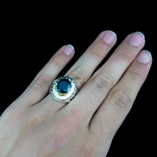 انگشتر نقره مردانه فاخر دست ساز طرح بابک با نگین یاقوت کبود الماس تراش