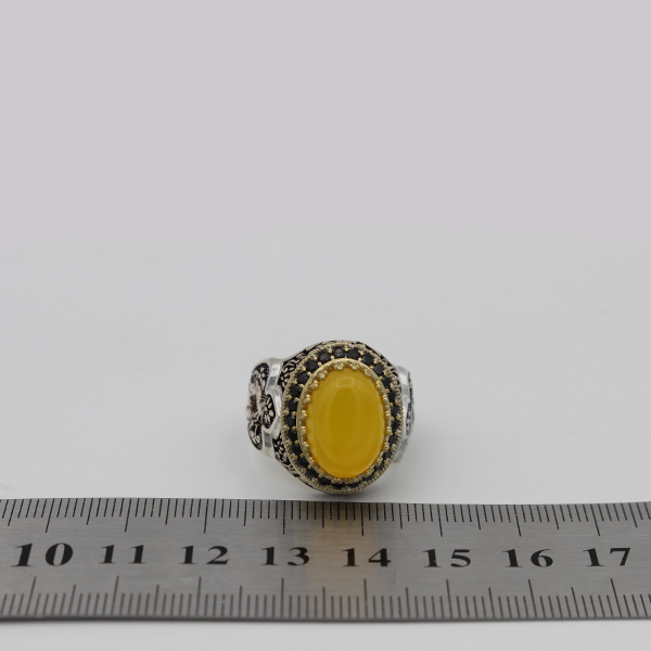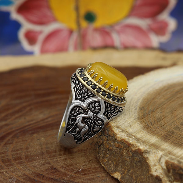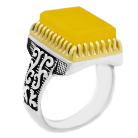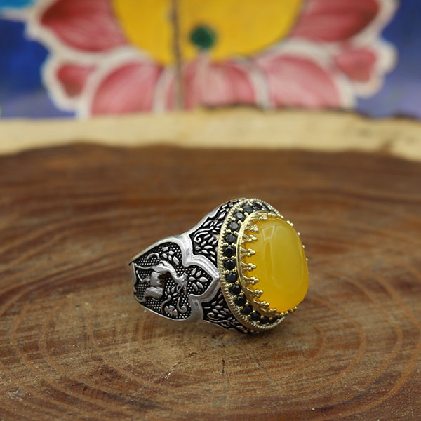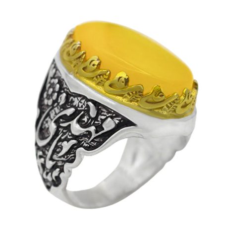 یک انگشتر فوقالعاده با نگین عقیق زرد اصلی که رزق و برکت را همراه خود دارد. نگین شرف الشمس، این انگشتر را به انتخابی بینظیر برای کسانی تبدیل کرده است که به دنبال تاثیرات معنوی سنگها و ادعیه معتبر هستند (حکاکی ذکر پر فضیلت شرف شمس در پشت نگین با آداب معین و در زمان خاص). در کنار چنگهای طلایی رنگ انگشتر شما نگینهای اتمی را میبینید که سبب زیبایی این انگشتر گردیده است. چنگهای طلایی رنگ انگشتر نیز از جنس برنج بوده و با گذشت زمان تغییر رنگ نخواهد داد.