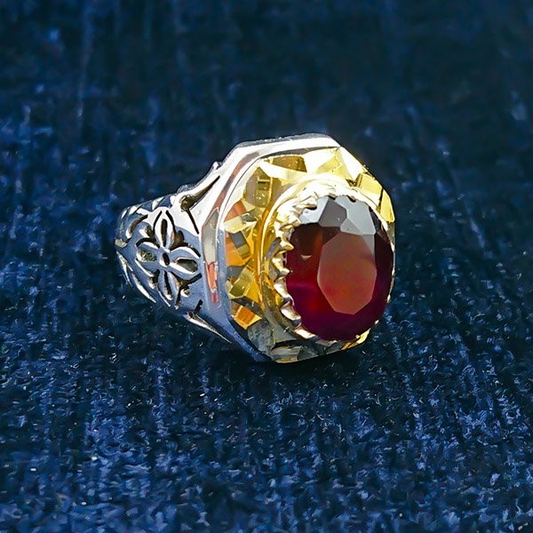 انگشتر نقره مردانه طرح آرش انگشتری فاخر و دست ساز است که دارای استحکام بالایی می باشد. چنگ های این انگشتر طلایی رنگ بوده و به خوبی نگین انگسنر را گرفته است. نگین انگشتر گارنت اصلی و معدنی می باشد که از رنگ قرمز بهره می برد و همچنین نگین انگشتر دارای تراش الماسی است که بر جذابیت انگشتر افزوده است. جنس انگشتر از نقره با عیار ۹۲۵ بوده و می تواند برای هر سایز انگشتی سایز شود.