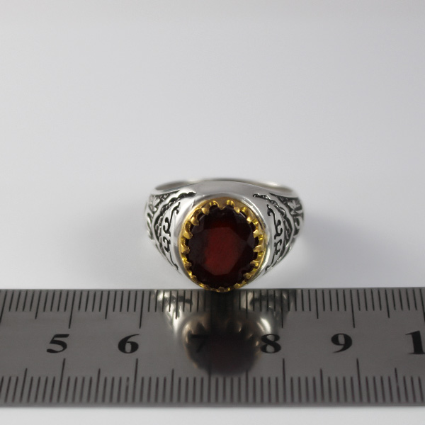 انگشتر مردانه طرح دور طلایی یا علی از نقره با عیار ۹۲۵ ساخته شده است. سنگ این انگشتر گارنت اصل می باشد که رنگی سرخ دارد و به صورت الماس شکل تراش داده شده است. روی رکاب نام یا علی (ع) با نقشی زیبا طراحی شده که جلوه ای معنوی به انگشتر داده است. این طرح با سیاه قلم تزئین شده تا جلوه بیشتر و برجسته تری پیدا کند. نگین این انگشتر را چنگ های ریز طلایی از جنس برنج احاطه کرده اند که تعداد زیاد آن ها سبب ثبات کامل نگین روی انگشتر شده است. این چنگ ها از جنس فلز برنج می باشد و رنگ طلایی آن تغییر نمی کنند. این انگشتر در اندازه های مختلف قابل سایز شدن می باشد.