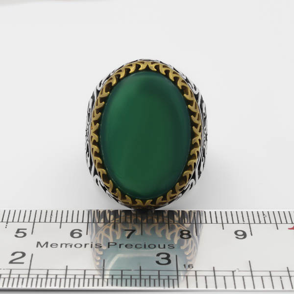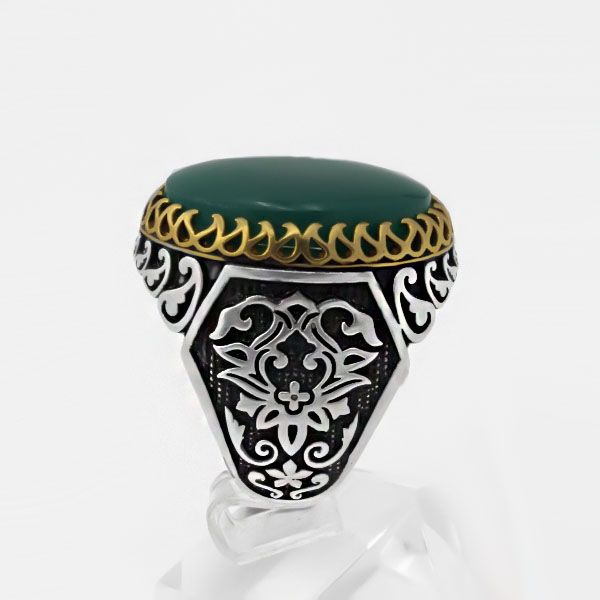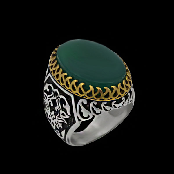 انگشتر عقیق سبز نقره مردانه طرح دور طلایی فاخر کمیل