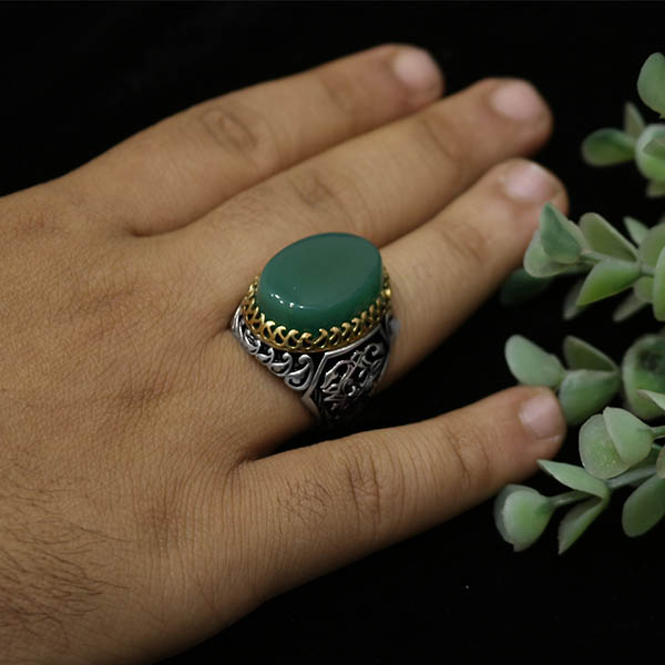 انگشتر مردانه عقیق سبز طرح دورطلایی فاخر کمیل ۲