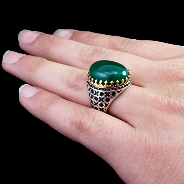 انگشتر عقیق سبز نقره مردانه طرح دور طلایی رامیار