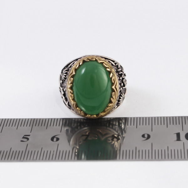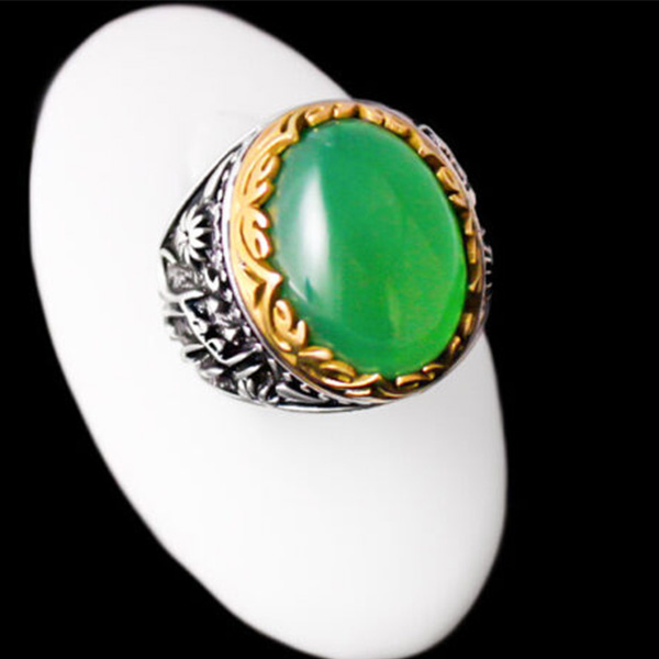 انگشتر عقیق سبز دور طلایی یا حسین یا ابوالفضل از نقره با عیار ۹۲۵ ساخته شده است. رکاب این انگشتر بسیار مستحکم و قوی ساخته شده و در یک طرف رکاب نام یا حسین و در طرف دیگر رکاب نام یا ابولفضل حک شده است. چنگ های طلایی رنگ انگشتر به شکل علی می باشد و از جنس برنج می باشد و تغییر رنگ نمی دهد. ارزش بالای این انگشتر به نگین عقیق سبز اصل می باشد که بسیار یکنواخت و صاف بوده و مناسب حکاکی انواع آیات و عبارات دلخواه می باشد. این محصول در اندازه های مختلف قابل سایز شدن می باشد.
