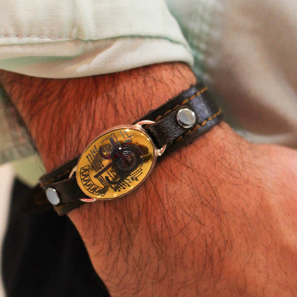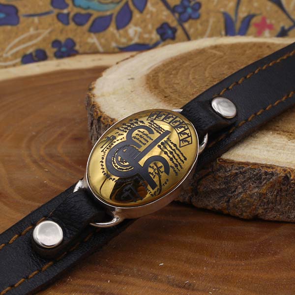 دستبند حدید صینی نقره چرم طبیعی مشکی مردانه و زنانه طرح عین علی (ع) + حرز امام جواد (ع)