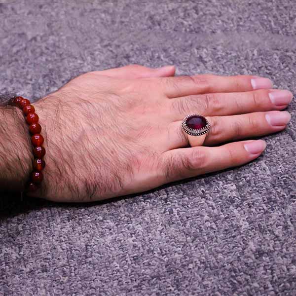 انگشتر یاقوت سرخ ست‌شده با تسبیح یا دستبند عقیق سرخ