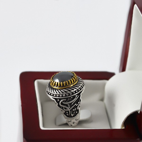 انگشتر حدید صینی مردانه طرح لبیک یا حسین دارای رکابی جذاب و منحصر به فرد است. این رکاب طرح ها و نگاره های چشم نوازی دارد و ذکر مبارک لبیک یا حسین به روی آن حکاکی شده است و در قسمت اطراف چنگ انگشتر طرح های مارپیچ و چشم نوازی نیز وجود دارد و قسمت طلایی رنگ آن از برنج ساخته شده و تغییر رنگ نمی دهد و جلوه بسیاری به محصول بخشیده است. جنس رکاب این انگشتر از نقره ۹۲۵ عیار است و ضمن داشتن زیبایی از استحکام و دوام بالایی نیز برخوردار است. جنس نگین سنگ حدید صینی اصل و معدنی است که خواص معنوی بسیار و رنگ مشکی بی نظیری دارد و درخشنده و صیقلی است و از جانب امام صادق (ع) نیز توصیه شده است. این انگشتر قابلیت سایز شدن برای هر سایز انگشتی را دارد.