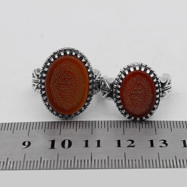 انگشتر ست عقیق سرخ نقره مردانه و زنانه طرح مروت + حرز امام جواد (ع) + آیت الکرسی