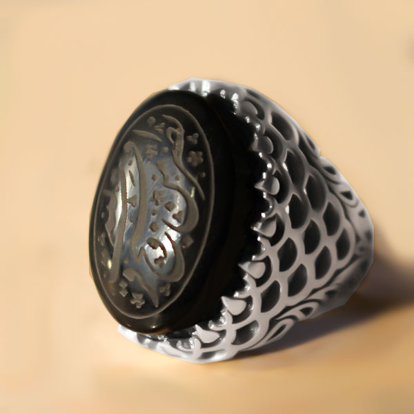 انگشتر عقیق مشکی نقره مردانه طرح “نصر من الله و فتح قریب” از نقره ۹۲۵ عیار ساخته شده است. این انگشتر دارای رکابی جذاب و نگینی زیبا میباشد که رکاب آن طرحی حصیری دارد. نگین انگشتر دارای حکاکی هنری و جذاب ذکر «نصر من الله و فتح قریب» می باشد. جنس نگین عقیق مشکی اصل میباشد که خواص معنوی بسیاری را داراست و از توصیه شده ترین سنگ ها میباشد. همچنین زیبایی ظاهری و سطحی صیقلی و مشکی رنگ و جذاب نیز دارد. این انگشتر برای هر سایز انگشتی سایز میگردد.