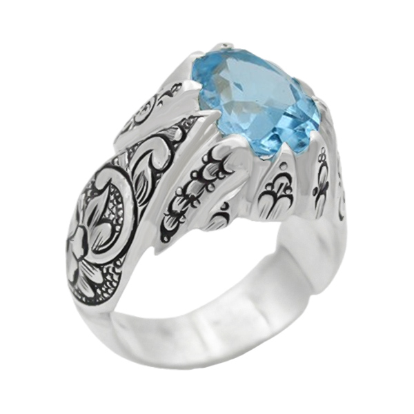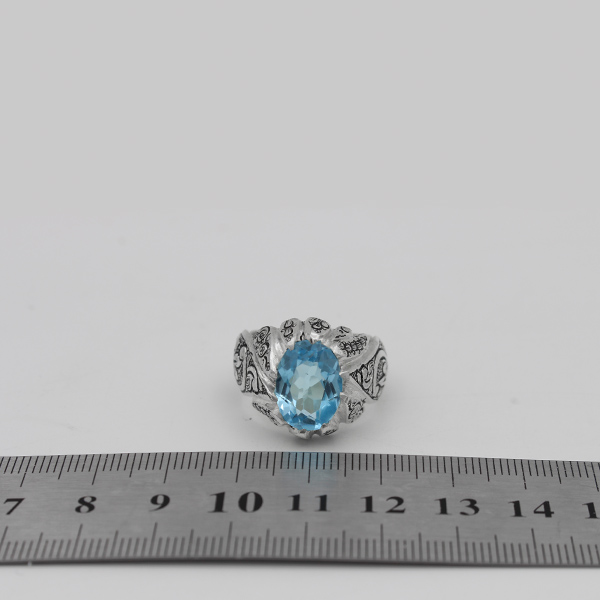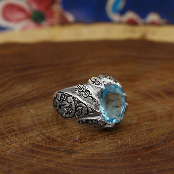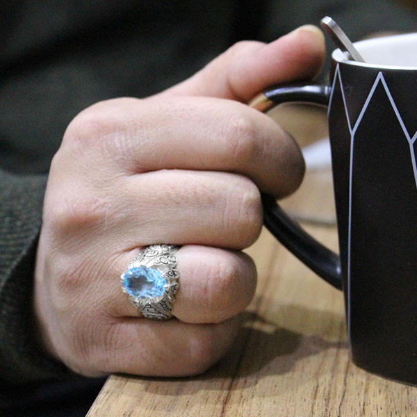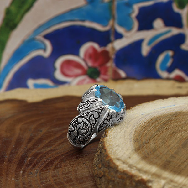 انگشتر توپاز الماس تراش نقره مردانه دست ساز طرح قلم زنی نیما