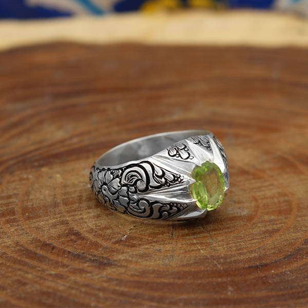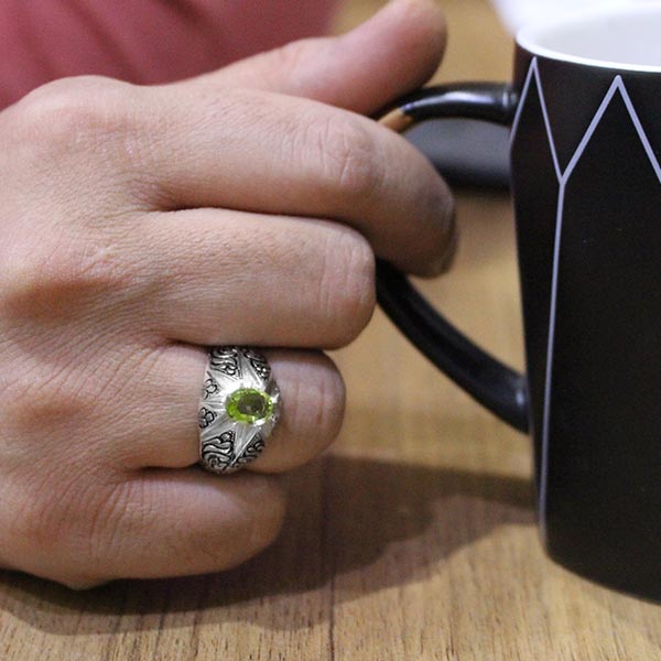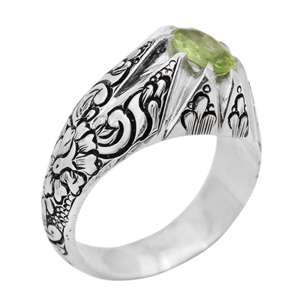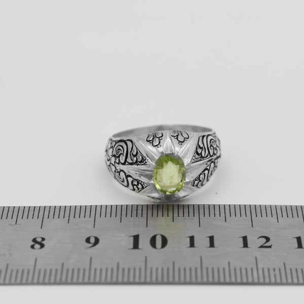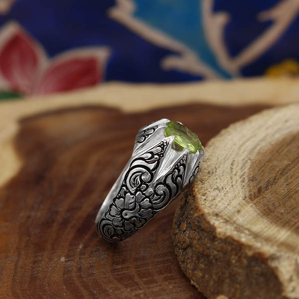 انگشتر زبرجد الماس تراش نقره مردانه دست ساز طرح قلم زنی مهراد