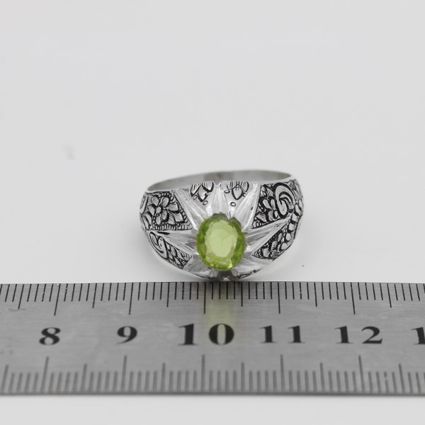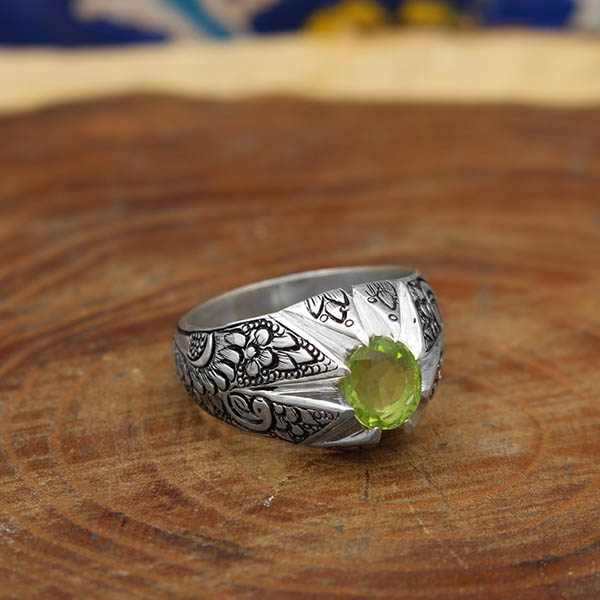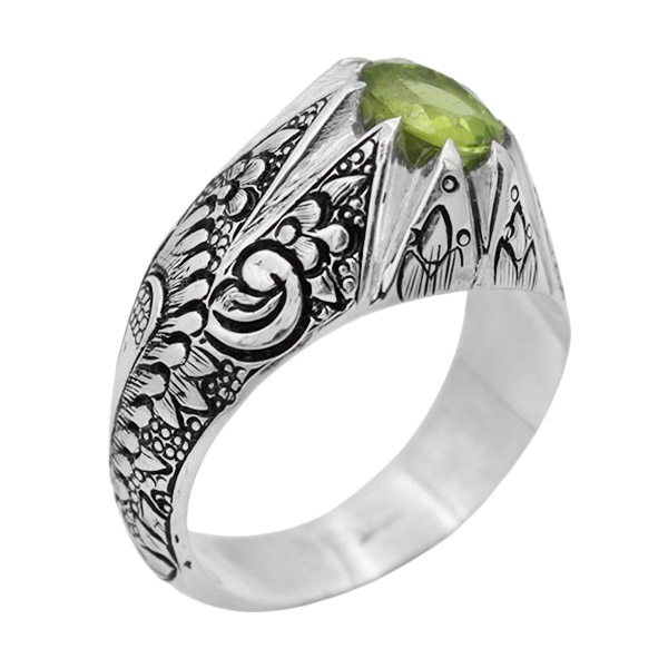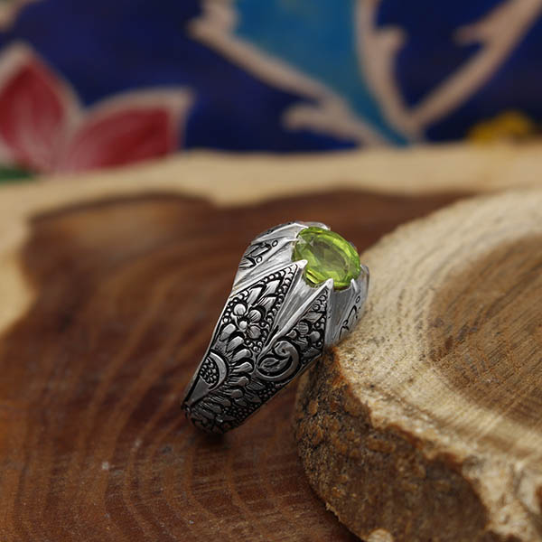 انگشتر زبرجد الماس تراش نقره مردانه دست ساز طرح قلم زنی پاشا