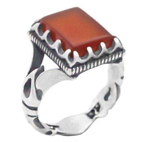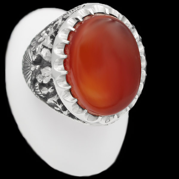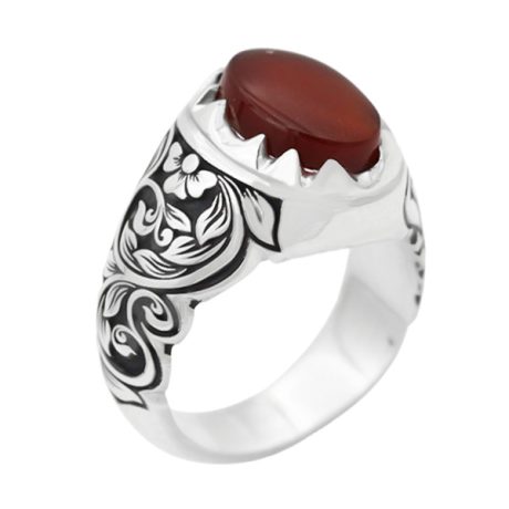 انگشتر عقیق سرخ نقره مردانه دست ساز فاخر طرح قلم زنی سه بعدی قبلتَین