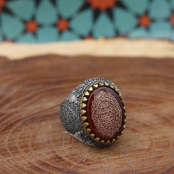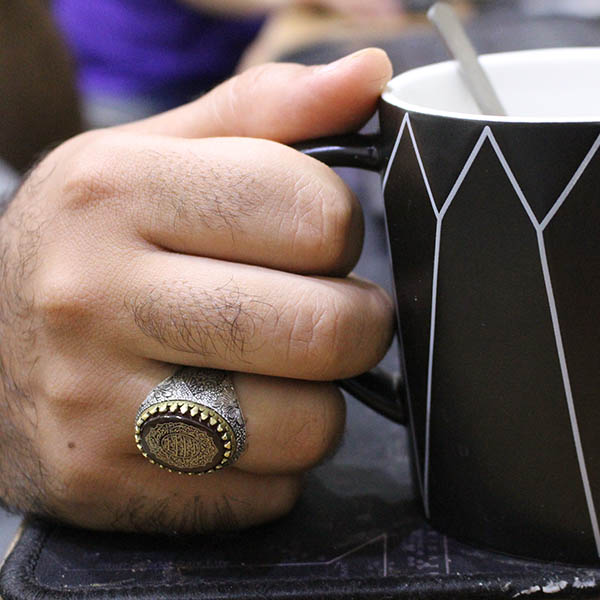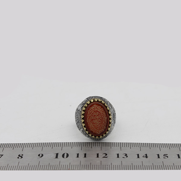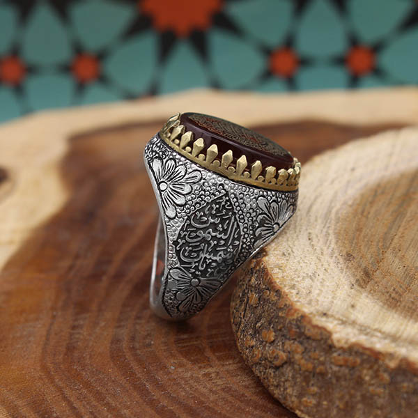 بر یک طرف این انگشتر عبارت زیبای “یا انیس النفوس” و در طرف دیگر عبارت “یا شمس الشموس” به صورت لیزری با کیفیت بسیار بالا حکاکی شده است. طرح های قلم زنی این انگشتر دست ساز است و به دست یکی از هنرمندان حرفه ای مشهدی انجام شده است.
