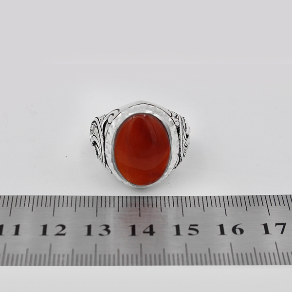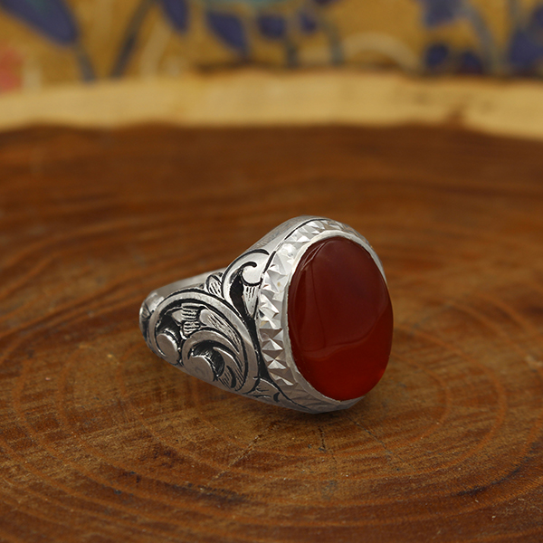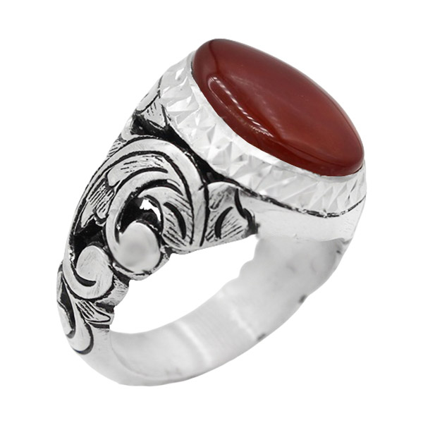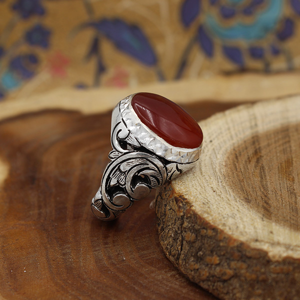 انگشتر عقیق سرخ یمنی نقره مردانه دست ساز طرح قلم زنی روزبه