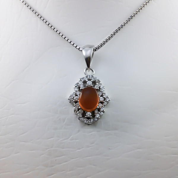 گردنبند نقره زنانه طرح زیلان به وسیله نگین های ریز اتمی در اطراف گردنبند با زیبایی و دقت بالایی تزئین شده است. این گردنبند از نقره با عیار ۹۲۵ ساخته شده و به وسیله رادیوم آبکاری شده است که این طراحی در کنار نگین های اتمی و همینطور استفاده از نگین عقیق یمنی سرخ معدنی و اصل خوش رنگ و چشم نواز که به صورت بیضی تراش داده شده است و کاملا پاک میباشد درخشش خیره کننده ای به این گردنبند داده است. توجه داشته باشید که قیمت این گردنبند بدون در نظر گرفتن زنجیر موجود در عکس است.