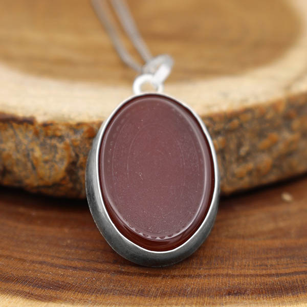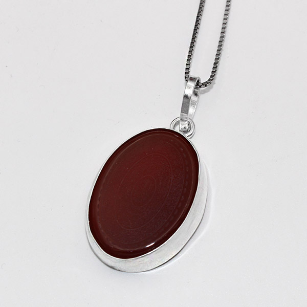 گردنبند عقیق سرخ طرح اذکار متبرکه از نقره با عیار ۹۲۵ ساخته شده است. نگین این گردنبند عقیق سرخ اصل و طبیعی می باشد که به صورت بیضی تراش داده شده است. سنگ عقیق سرخ که از لحاظ معنوی بسیار پر خاصیت هست و از جمله سنگ هایی میباشد که توسط معصومین (ع) توصیه شده است. این گردنبند دست ساز و کیفیت ساخت آن مناسب ارزیابی می شود. بر روی این سنگ حکاکی بسیار باکیفیت و زیبایی انجام شده است که اوج ظرافت حکاکی در این اثر هنری هویدا شده است.