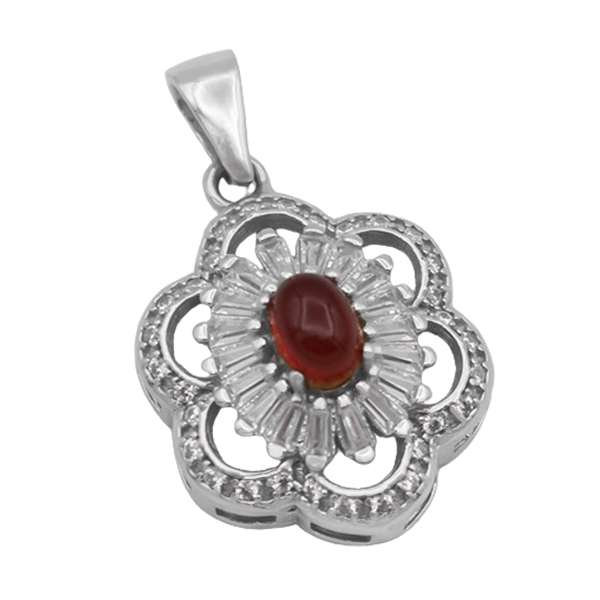گردنبند عقیق سرخ طرح صدف از نقره با عیار ۹۲۵ ساخته شده است. نگین این گردنبند عقیق سرخ اصل و طبیعی میباشد که به صورت بیضی تراش داده شده است. اطراف این نگین در یک ردیف بیضی، از نگین های ریز اتمی باگت با تراکم بالا استفاده شده است که در ادامه آن نیز در قالب هایی با شکل و طراحی گل شاهد به کارگیری از این نگین های زیبا و درخشان هستیم. آبکاری این محصول به وسیله رادیوم به ارزش و درخشش آن افزوده و جلای محصول را حفظ میکند. توجه داشته باشید که قیمت این گردنبند بدون درنظر گرفتن زنجیر موجود در عکس است.