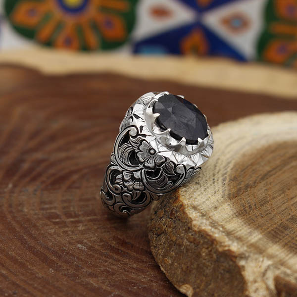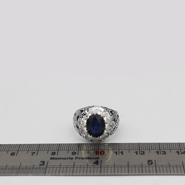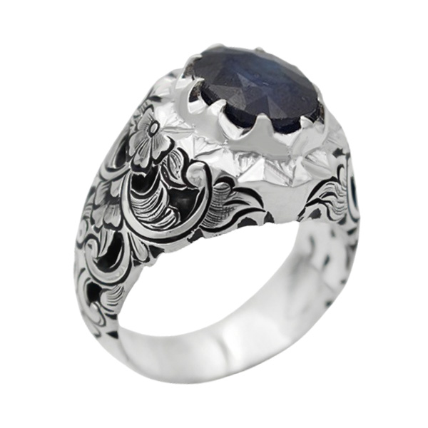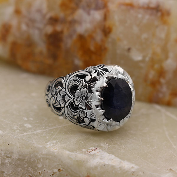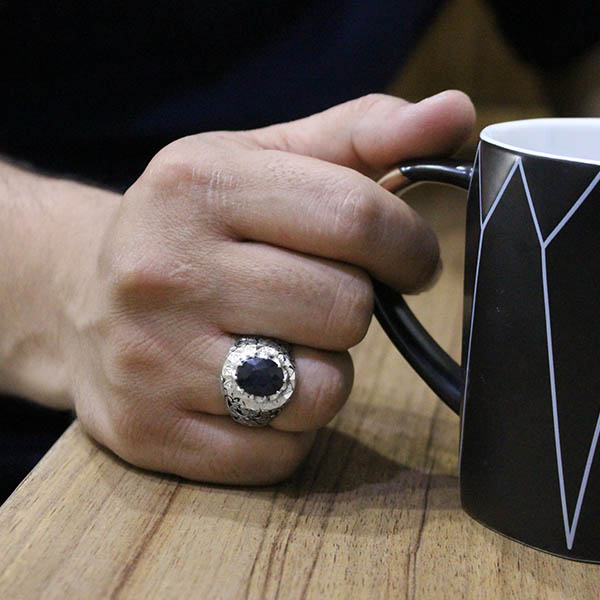 انگشتر یاقوت کبود الماس تراش نقره مردانه دست ساز طرح جمشید