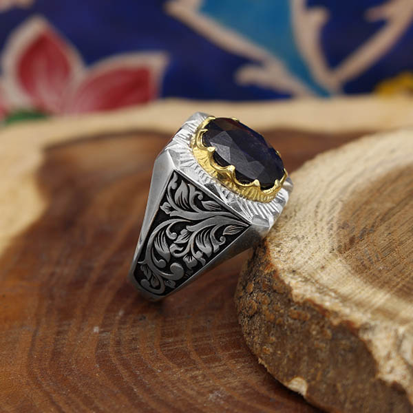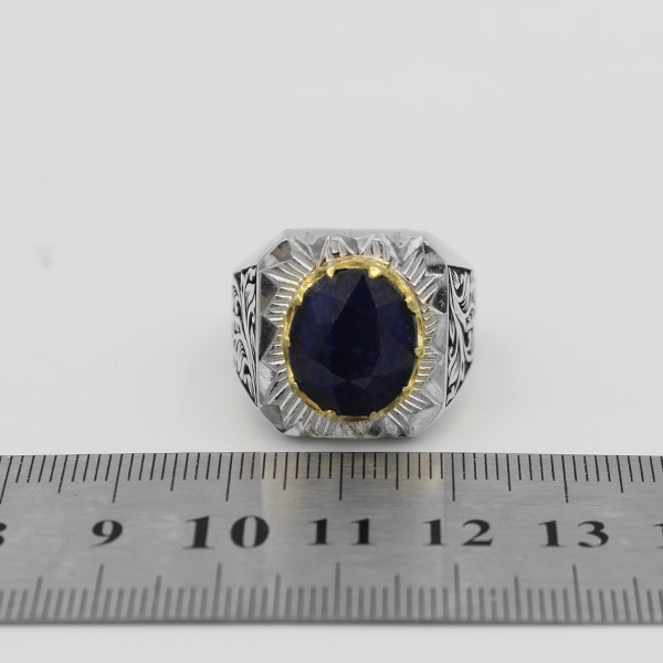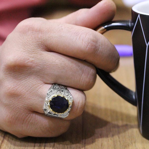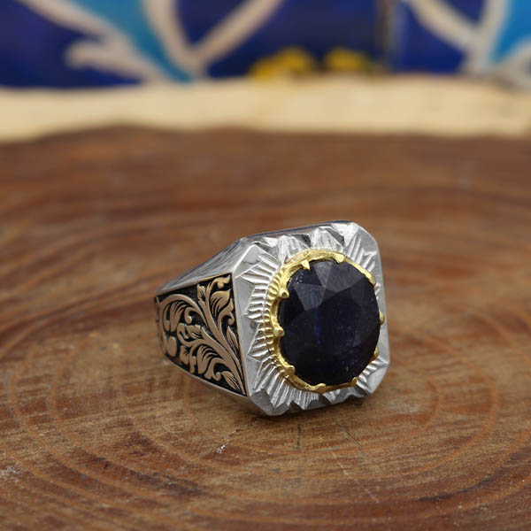 انگشتر یاقوت کبود الماس تراش نقره مردانه دست ساز طرح کارون
