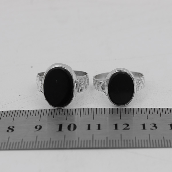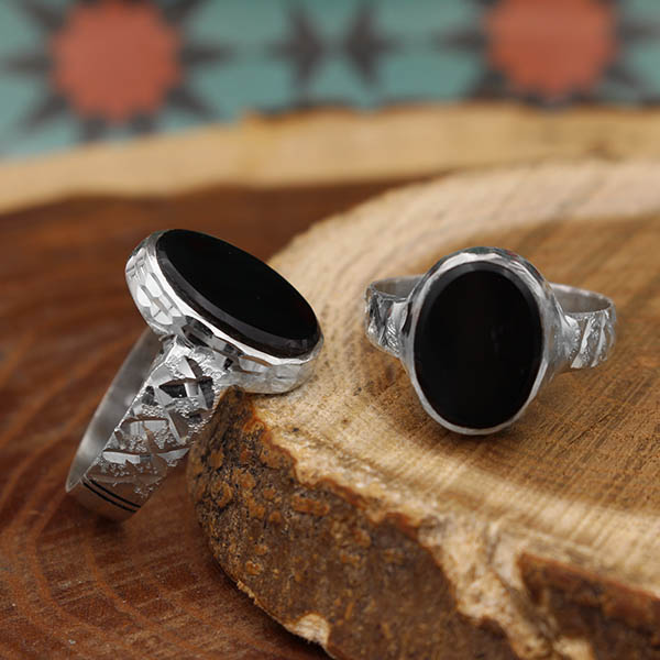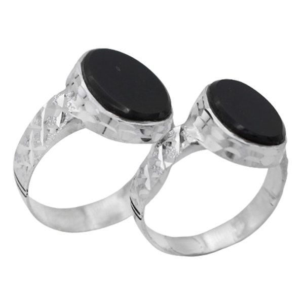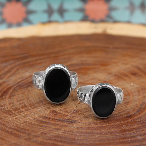 انگشتر ست زنانه و مردانه عقیق مشکی نقره دست ساز طرح آیینه کاری محتشم + حرز امام جواد (ع)