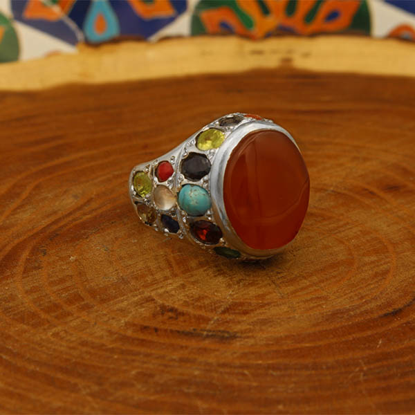 سنگ های این انگشتر چند سنگ فاخر عبارتند از: حدید صینی، زمرد، آمیتیست، فیروزه نیشابوری، گارنت، لاجورد، الکساندریت، درنجف، زبرجد، عقیق سرخ یمنی و یاقوت کبود میباشند که همگی این مواردی که گفته شد اصل و معدنی هستند و در کنار آنها دو نگین دلربا و مرجان نیز در آن به کار رفته است. رکاب این انگشتر فاخر، دست ساز بوده و قابلیت سایز شدن برای هر سایز انگشتی را دارد.