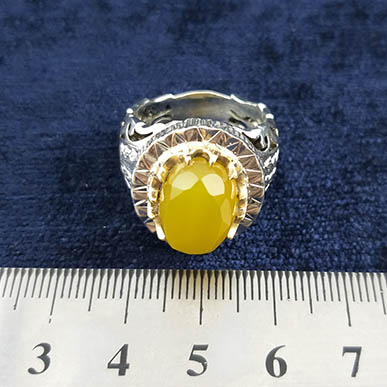 انگشتر نقره مردانه کوروش با نگین الماس تراش بسیار زیبا یکی از فاخرترین محصولات سایت شرف آنلاین می باشد. طرح فاخر این انگشتر، با آیینه کاری دور نگین، درخشش زیبایی به آن بخشیده است. جنس انگشتر از نقره عیار ۹۲۵ است و برای هر انگشتی می تواند سایز شود. نگین انگشتر نیز از عقیق زرد اصل و الماس تراش و با حکاکی بسیار پر فضیلت شرف الشمس است (حکاکی ذکر پر فضیلت شرف شمس در پشت نگین زرد با آداب و در زمان مخصوص) خواص افزایش رزق و روزی، دفع چشم زخم، افزایش ثواب نماز و گشایش در کارها از جمله خواص شگفت انگیز عقیق شرف الشمس می باشد. نگین الماس تراش آن و رکاب دست ساز و فوق العاده با طرح آیینه کاری منحصر به فرد و فاخر آن جلوه ای بسیار خاصی به این انگشتر بخشیده که توجه همه را جلب می کند.