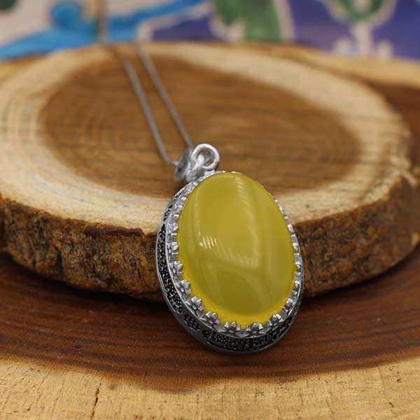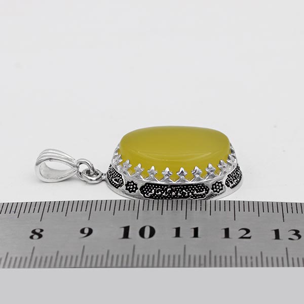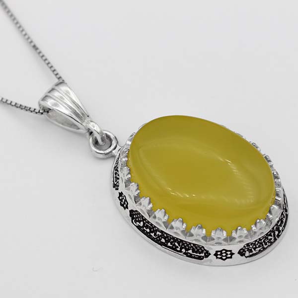 این گردنبند با طراحی ساده، گزینه‌ای ایده‌آل برای سلیقه‌های مختلف محسوب می‌شود و هم برای خانم‌ها و هم آقایان مناسب است. فریم آن از نقره با عیار ۹۲۵ ساخته شده و ابعاد گردنبند همراه با نگین عقیق زرد در تصاویر قابل مشاهده است. در اطراف نگین قسمتی از آیه شریفه آیه الکرسی (اَللَّـهُ لَا إِلَـٰهَ إِلَّا هُوَ الْحَيُّ الْقَيُّومُ ۚ لَا تَأْخُذُهُ سِنَةٌ وَلَا نَوْمٌ ۚ لَّهُ مَا فِي السَّمَاوَاتِ وَمَا فِي الْأَرْ‌ضِ) به چشم می‌خورد. این فریم با استحکام بالا، نگین را در بر گرفته و در قسمت بالایی، یک آویز نقره‌ای متصل شده که ارتباط محکمی بین زنجیر و گردنبند ایجاد می‌کند. نگین این گردنبند، عقیق زرد اصل و معدنی است که در متون اسلامی خواص متعددی برای آن ذکر شده است. (حکاکی ذکر پر فضیلت شرف الشمس در پشت نگین زرد رنگ با آداب خاص و در زمان خاص آن).  لازم به ذکر است که قیمت این محصول بدون در نظر گرفتن زنجیر نمایش داده‌شده در تصویر محاسبه شده است.