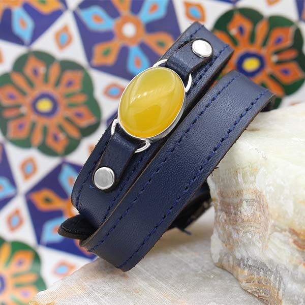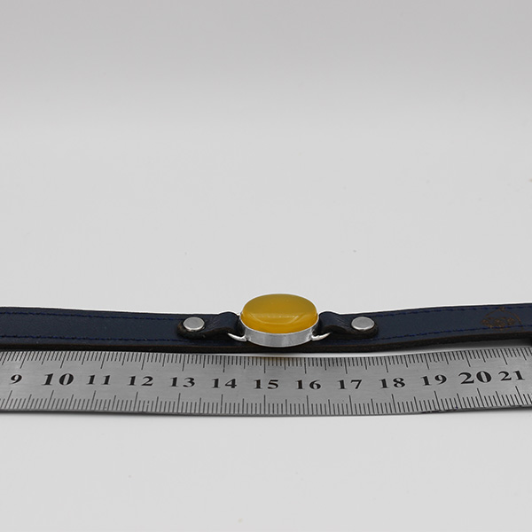 چرم استفاده شده در این محصول چرم طبیعی و به رنگ سورمه ای براق است. در این محصول از چرم طبیعی با کیفیت استفاده شده که مدلی خاص اما ساده است. نگین این محصول عقیق شرف شمس اصل و معدنی است که رنگ زرد مناسبی دارد و طبق کتب معتبر دارای خواص بی شماری است (حکاکی ذکر با برکت شرف شمس پشت نگین در زمان مقرر و با آداب خاص). جنس فریم دستبند از نقره اصل است که استحکام و دوام مناسبی دارد و با دو بند چرمی محکم به دستبند متصل شده است. این فریم دست ساز است و به دست یکی از هنرمندان نقره ساز مشهدی ساخته شده است. کیفیت ساخت فریم مناسب ارزیابی می شود و به صورت کاملا محکم سنگ عقیق را دربرگرفته است. این دستبند مشابه ساعت بوده و برای هر سایز مچی مناسب است.