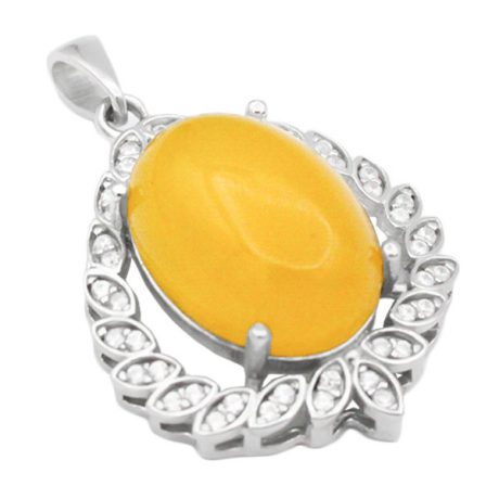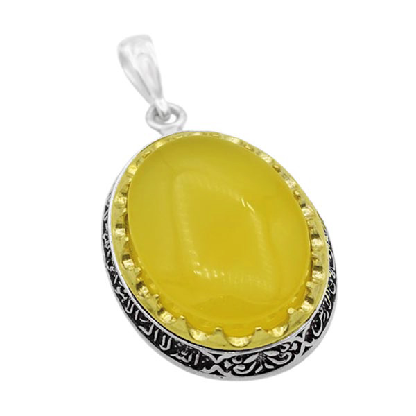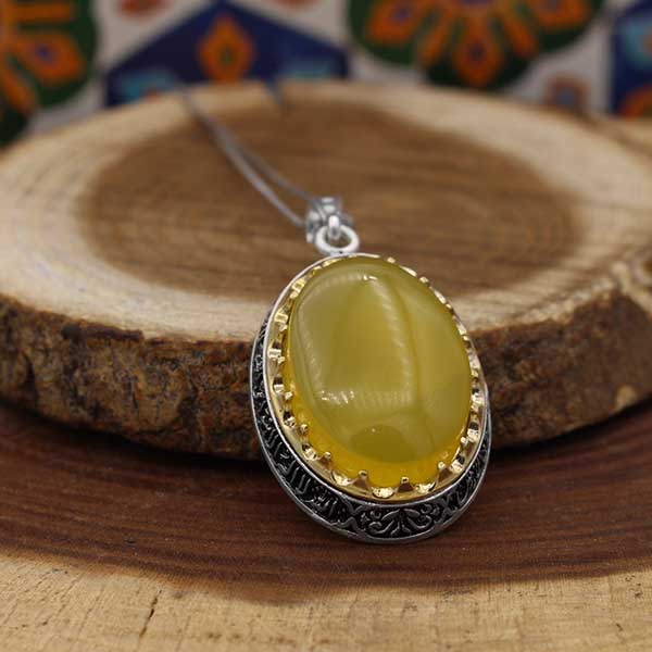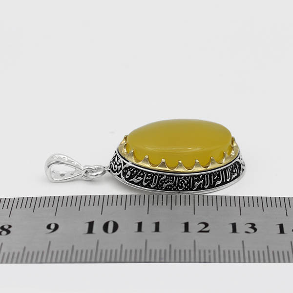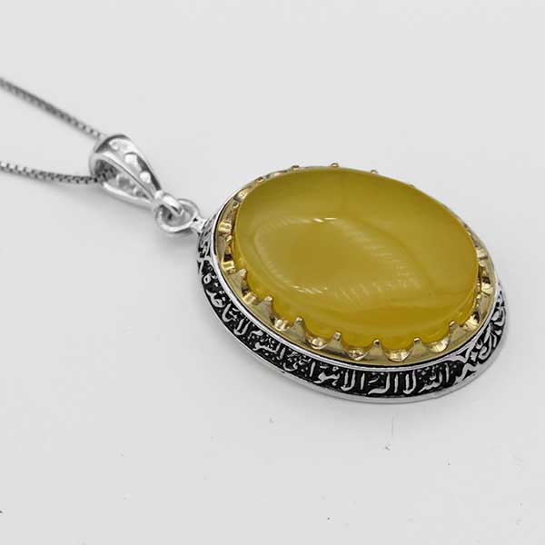 این گردنبند با طراحی ساده، انتخابی ایدهآل برای سلیقههای مختلف بوده و هم برای خانمها و هم آقایان مناسب است. فریم آن از نقره با عیار ۹۲۵ ساخته شده و ابعاد گردنبند به همراه نگین عقیق زرد در تصاویر قابل مشاهده است. در اطراف نگین، بخشی از آیه شریفه آیهالکرسی (اَللَّـهُ لَا إِلَـٰهَ إِلَّا هُوَ الْحَيُّ الْقَيُّومُ ۚ لَا تَأْخُذُهُ سِنَةٌ وَلَا نَوْمٌ ۚ لَّهُ مَا فِي السَّمَاوَاتِ وَمَا فِي الْأَرْضِ) نقش بسته است. فریم این گردنبند با استحکام بالا، نگین را بهخوبی در بر گرفته و یک آویز نقرهای در قسمت بالایی آن تعبیه شده که اتصال محکمی بین گردنبند و زنجیر برقرار میکند. چنگهای طلاییرنگی که نگین را نگه داشتهاند، از جنس برنج بوده و در برابر تغییر رنگ مقاوم هستند. نگین این گردنبند، عقیق زرد اصل و معدنی است که در متون اسلامی خواص متعددی برای آن ذکر شده است. (حکاکی ذکر پر فضیلت شرف الشمس در پشت نگین زرد رنگ با آداب خاص و در زمان خاص آن). توجه داشته باشید که قیمت این محصول بدون احتساب زنجیر نمایش دادهشده در تصویر محاسبه شده است.