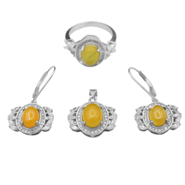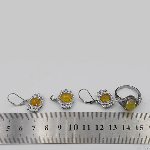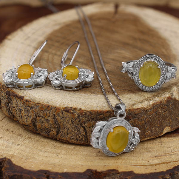 نیم ست شرف الشمس زنانه طرح اپیک از نقره ۹۲۵ عیار ساخته شده و طراحی خاص و منحصر به فرد رکاب نقش چشم گیری در افزایش جذابیت این محصول دارد.استفاده از نگین های ریز اتمی در ابعاد و اندازه های مختلف باعث افزایش جذابیت و درخشش محصول شده و این محصول ضمن داشتن ظرافت از استحکام بالایی برخوردار است و کیفیت سوار شدن نگین روی آن مناسب ارزیابی میشود. این نیم ست دارای آبکاری رادیوم نیز می باشد که در برابر خراش،آسیب،ضرب خوردگی،مواد شیمیایی و… مقاوم است و مانع کدر شدن و تغییر رنگ محصول میگردد.جنس نگین عقیق زرد خراسانی اصل و معدنی بوده که دارای حکاکی دعای پر فضیلت شرف الشمس طبق آداب می باشد و از خواص معنوی بسیاری برخوردار است.انگشتر این نیم ست قابلیت سایز شدن برای هر سایز انگشتی را دارد.