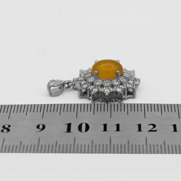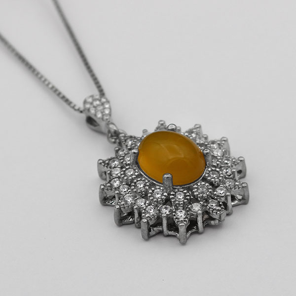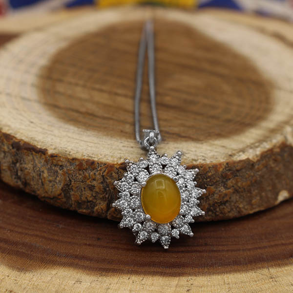گردنبند نقره زنانه شرف الشمس با نگین عقیق زرد اصل و دعای شرف الشمس، جواهری است که زیبایی و خواص معنوی را با هم ترکیب می‌کند. نقره 925 با آبکاری طلا سفید، از تغییر رنگ و کدر شدن گردنبند جلوگیری می‌کند و درخشش آن را برای مدت طولانی حفظ می‌کند. نگین‌های اتمی اطراف عقیق زرد، جلوه‌ای بی‌نظیر به این گردنبند بخشیده و آن را به جواهری چشمگیر تبدیل کرده‌اند. این گردنبند نه تنها شما را زیباتر می‌کند، بلکه خواص مادی و معنوی زیادی را نیز به شما هدیه می‌دهد (حکاکی ذکر پر فضیلت شرف شمس در پشت نگین با آداب معین و در زمان خاص). این طرح دارای تعدادزیادی نگین اتمی در مقایسه با سایر گردنبندها بوده که درخشش آن را دو چندان کرده است.