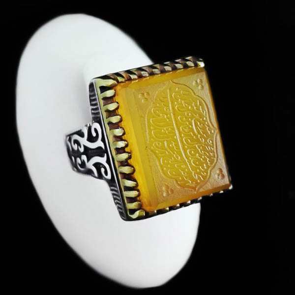 انگشتر شرف الشمس نقره مردانه طرح مهر دارای رکابی منحصر به فرد و جذاب است. این رکاب به صورت مستطیلی شکل و ظریف میباشد و از نقره ۹۲۵ عیار ساخته شده است. اطراف رکاب طرح ها و نگاره های آن به صورت کاملا متقارن در دو طرف محصول مشاهده میگردد و در پس زمینه این رکاب سیاه قلم کار شده است که در قسمت پشتی آن رنگ مشکی یکدست و جذابی را ایجاد کرده است. قسمت طلایی رنگ و چنگ انگشتر از برنج ساخته شده و جلوه بسیاری به محصول بخشیده است و تغییر رنگ نمیدهد. جنس نگین سنگ عقیق زرد اصل میباشد که دعای شرف الشمس مطابق آداب پشت نگین حکاکی شده و همچنین آیه مبارک «و من یتق الله» به صورت هنری و با خطی خوش به روی این نگین حکاکی شده است. عقیق خود دارای خواص معنوی بسیاری است و در روایات و متون دینی نیز توصیه شده است و همراه با دعای پر فضیلت شرف الشمس خواص و تاثیرات معنوی فراوانی را القا میکند. این انگشتر قابلیت سایز شدن برای هر سایز انگشتی را دارد.