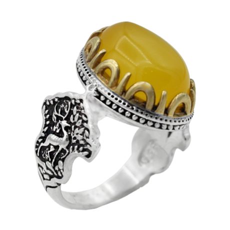 انگشتر شرف الشمس طرح یامهدی (عج) یاحسین (ع) دارای نگین بزرگتری در مقایسه با سایر نگینهای انگشتر مردانه دارد. در یک طرف رکاب طرح نوشته “یا مهدی” و در طرف دیگه طرح نوشته “یا حسین” را مشاهده میکنید. طرح نوشتههای این انگشتر دارای خطی بسیار زیبا و چشمنواز است. جنس انگشتر از نقره با عیار 925 بوده و قابلیت سایز شدن برای هر سایز انگشتی را دارد. طرح چنگهای رکاب این انگشتر طرح علی است که علاوه بر محکم نگه داشتن سنگ انگشتر، ظاهری زیباتر به انگشتر بخشیده است. نگین عقیق زرد این ر کاب در کنار دعای شرف الشمس میتواند گزینه خوبی برای افزایش رزق و روزی، دفع بلایا و عاقبت به خیری شود.