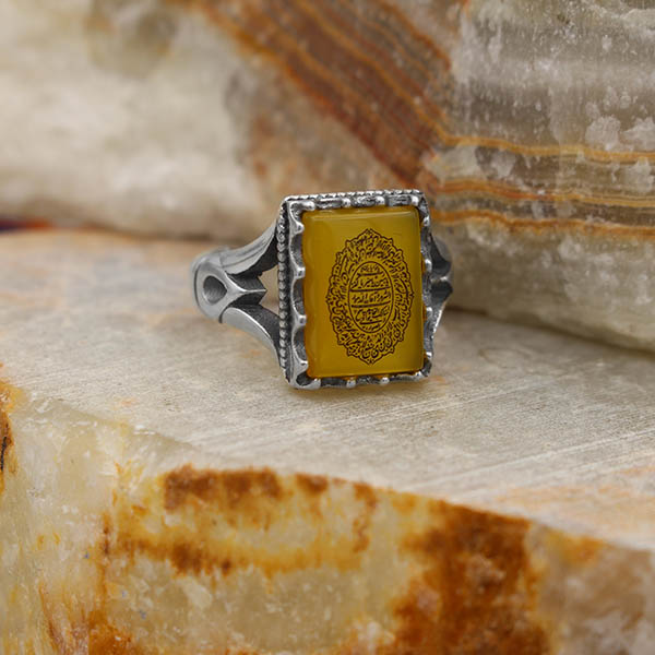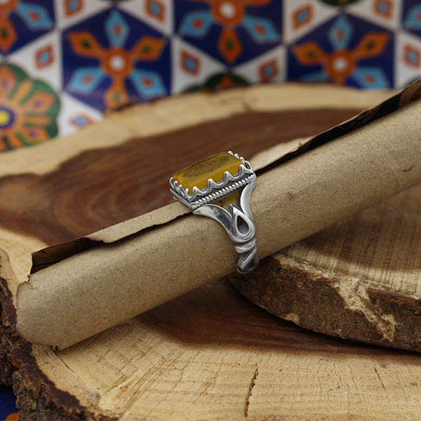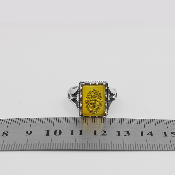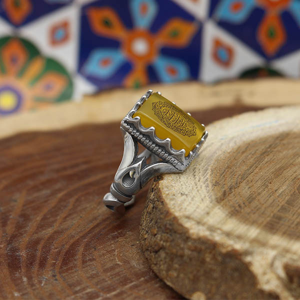 انگشتر طرح رهبری از نقره عیار ۹۲۵ است و قابلیت سایز شدن برای هر سایز انگشتی را دارا می باشد. بر روی نگین متن آیت الکرسی و حرز صغیر امام جواد (ع) با کیفیت بسیار مناسبی حکاکی شده است. نگین انگشتر نیز از عقیق زرد اصل و بسیار پر فضیلت شرف الشمس می باشد (حکاکی ذکر پر فضیلت شرف شمس در پشت نگین زرد با آداب و در زمان مخصوص). خواص افزایش رزق و روزی، دفع چشم زخم و گشایش در امور از جمله خواص مهم عقیق شرف الشمس می باشد. این انگشتر یکی از پرطرفدارترین طرح های انگشتر است و به جهت همه پسند بودن یکی از مناسبترین انگشترها جهت هدیه دادن می باشد.