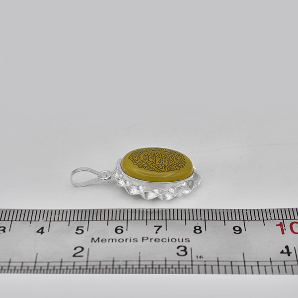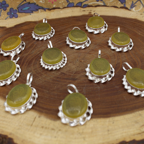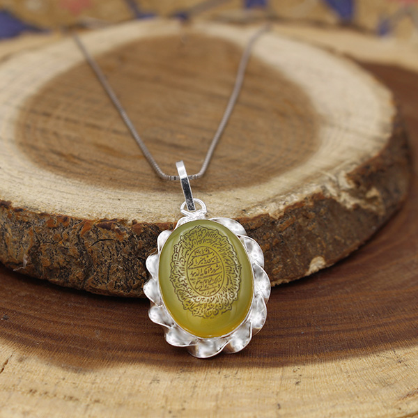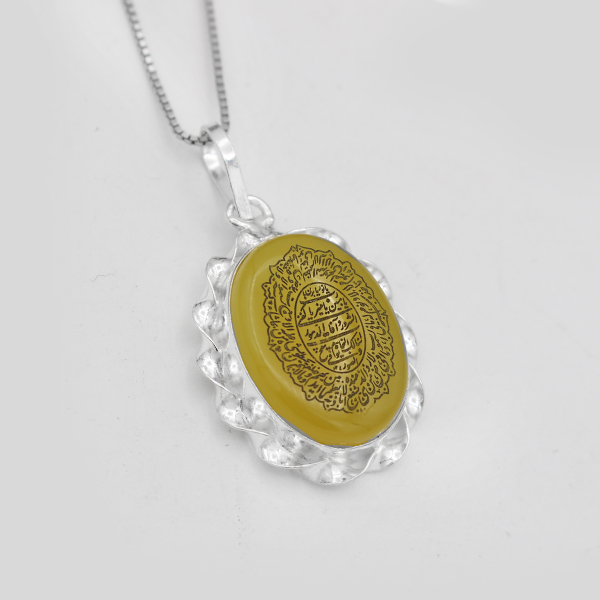 بر روی این نگین حکاکی حرز صغیر امام جواد (ع) به صورت لیزری و با کیفیت بسیار خوبی انجام شده و دور تا دور حرز “آیت الکرسی” حک شده است. ظرافت حکاکی این دو فراز از قرآن و روایات ائمه بسیار مناسب است و زیبایی هنری خاصی به این گردنبند داده است. فریم این گردنبند ساده و زیبا از جنس نقره است و به خوبی جلا داده شده و درخشان است. این فریم دست ساز است و به دست یکی از هنرمندان نقره ساز مشهدی ساخته شده است. کیفیت ساخت فریم مناسب ارزیابی می شود و به صورت کاملا محکم سنگ عقیق را دربرگرفته است. نگین این گردنبند عقیق شرف الشمس اصل و معدنی است که در کتب اسلامی خواص زیادی برای آن ذکر شده است (حکاکی دعای پر فضیلت شرف شمس در پشت نگین زرد رنگ با آداب معین و در زمان خاص). کیفیت این سنگ مناسب ارزیابی می شود. این گردنبند مناسب کسانی است که هم به دنبال زیبایی و در عین حال سادگی و هم به دنبال خواص مفید آیات قرآنی جهت حفظ از بلاها و خواص مفید ذکر شرف الشمس هستند.