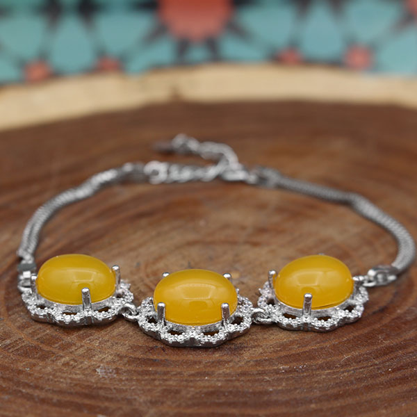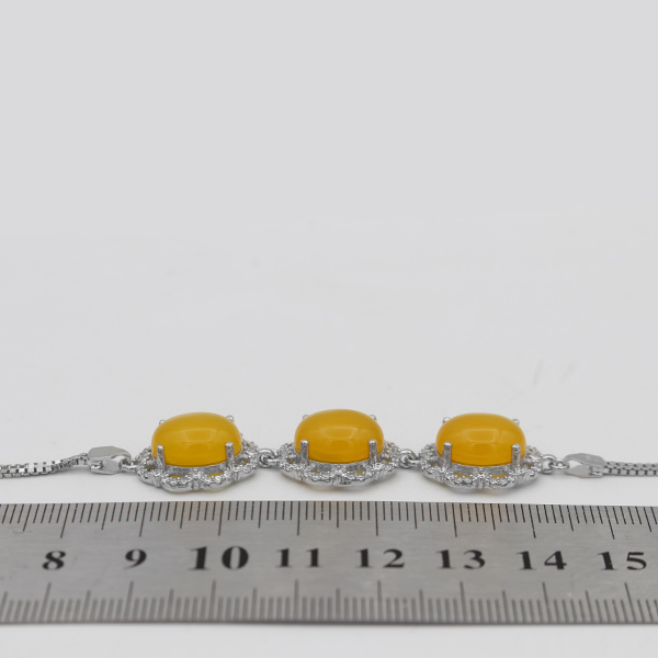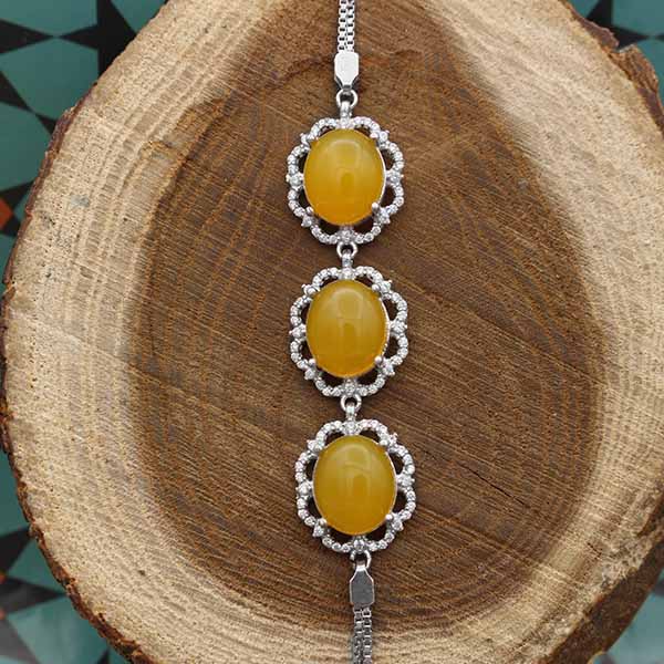 اگر بهدنبال زیوری با خواص معنوی زیاد و درخشش خاص هستید، این دستبند نقره شرف الشمس با سه نگین عقیق زرد طبیعی، انتخابی ایدهآل است (حکاکی ذکر پر فضیلت شرف شمس در پشت نگین با آداب معین و در زمان خاص). طراحی هنرمندانه، در کنار دعای شرف الشمس، آن را به یک جواهر ارزشمند تبدیل کرده است. آبکاری طلا سفید از تغییر رنگ آن جلوگیری کرده و نگینهای اتمی ریز، زیبایی آن را دوچندان کردهاند. این دستبند ترکیبی از سنت و مدرنیته است و برای بانوانی که به جواهرات خاص و منحصربهفرد علاقه دارند، گزینهای عالی محسوب میشود. ابعاد نگین عقیق زرد این دستبند کمی بزرگتر در مقایسه با سایر نمونههای دستبند زنانه است. جنس این دستبند از نقره با عیار 925 است.