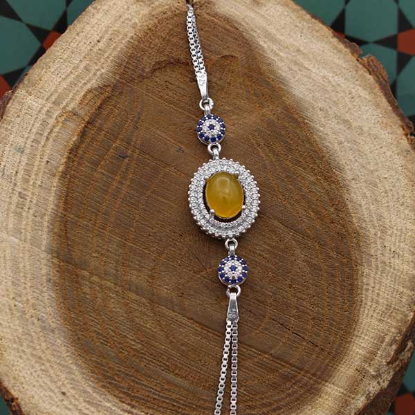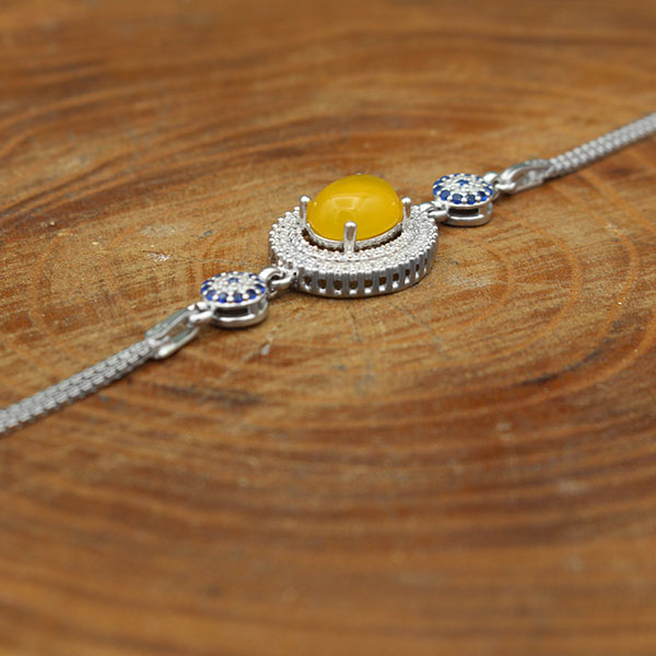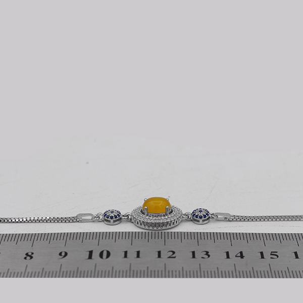 دستبند شرف الشمس مدل سوگند از نقره با عیار ۹۲۵ ساخته شده و با نگینهای ریز اتمی درخشان تزئین شده است. طراحی ظریف و استفاده از نگینهای اتمی آبی در اطراف عقیق زرد، زیبایی و جلوهای خاص به آن بخشیده است. آبکاری رادیوم روی این محصول، علاوه بر افزایش جذابیت و درخشش، مانع از تیرگی و تغییر رنگ آن میشود و جلوه نقره را حفظ میکند. نگین این دستبند از عقیق زرد معدنی و اصل میباشد. (حکاکی ذکر پر فضیلت شرف شمس در پشت نگین زرد با آداب و در زمان مخصوص). این سنگ ارزشمند، خواص فراوانی داشته و در روایات ائمه معصومین (ع) مورد تأکید قرار گرفته است. علاوه بر این، قفل محکم و بادوام دستبند، ایمنی بالایی را فراهم کرده و طراحی ظریف آن، جلوهای فانتزی و چشمنواز به آن بخشیده است.