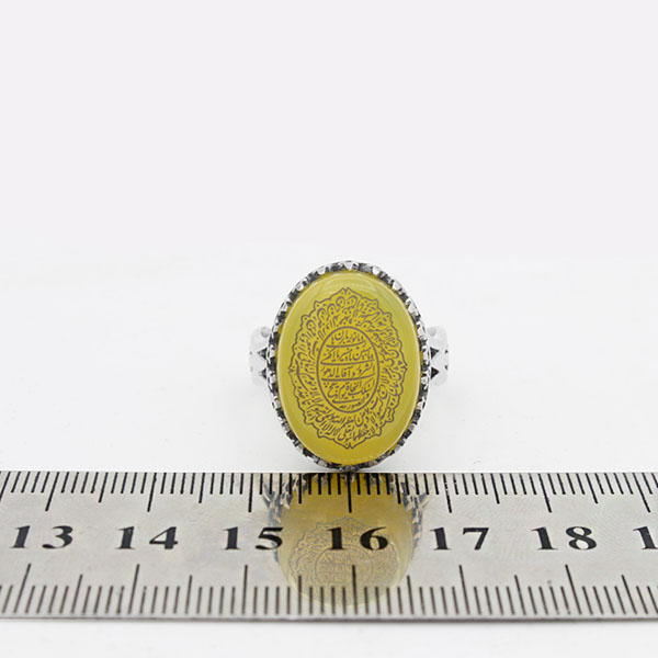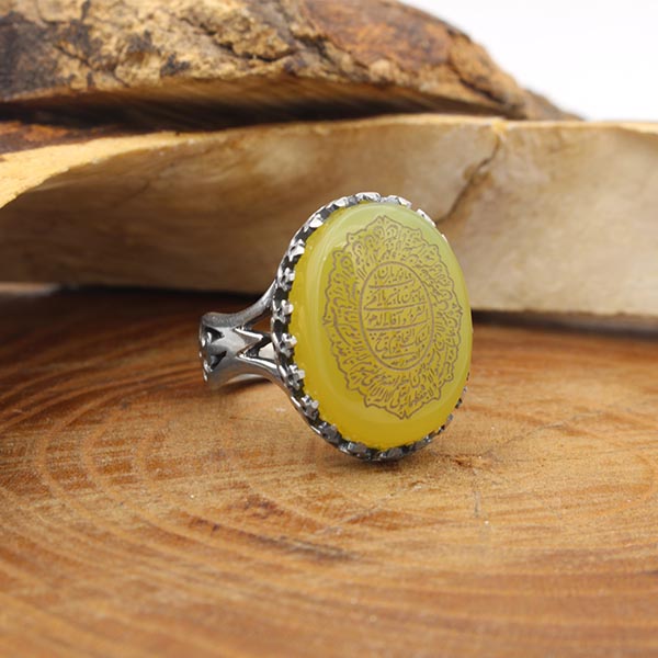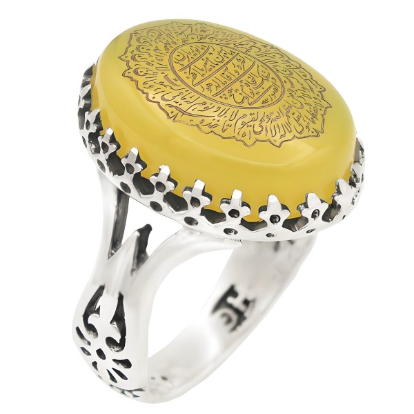 انگشتر طرح آیت الکرسی از نقره عیار ۹۲۵ است و قابلیت سایز شدن برای هر سایز انگشتی را دارا می باشد. ابعاد این نگین شرف الشمس حدود ۲ سانتی متر است که بر روی آن متن آیت الکرسی و حرز صغیر امام جواد (ع) با کیفیت بسیار مناسبی حکاکی شده است. نگین انگشتر نیز از عقیق زرد اصل و بسیار پر فضیلت شرف الشمس می باشد (حکاکی ذکر پر فضیلت شرف شمس در پشت نگین زرد با آداب و در زمان مخصوص). خواص افزایش رزق و روزی، دفع چشم زخم و گشایش در امور از جمله خواص مهم عقیق شرف الشمس می باشد. این انگشتر یکی از اصیل ترین طرح های انگشتر است و به جهت همه پسند بودن یکی از مناسبترین انگشترها جهت هدیه دادن می باشد. طرح شبکه این انگشتر به خوبی و با ظرافت بالا اجرا شده و کیفیت مناسبی دارد. امکان تغییر سایز برای این انگشتر مهیا می باشد.