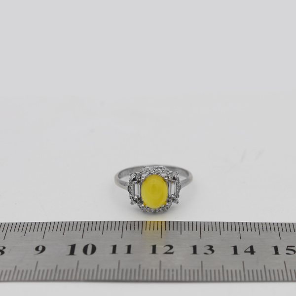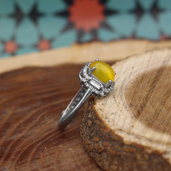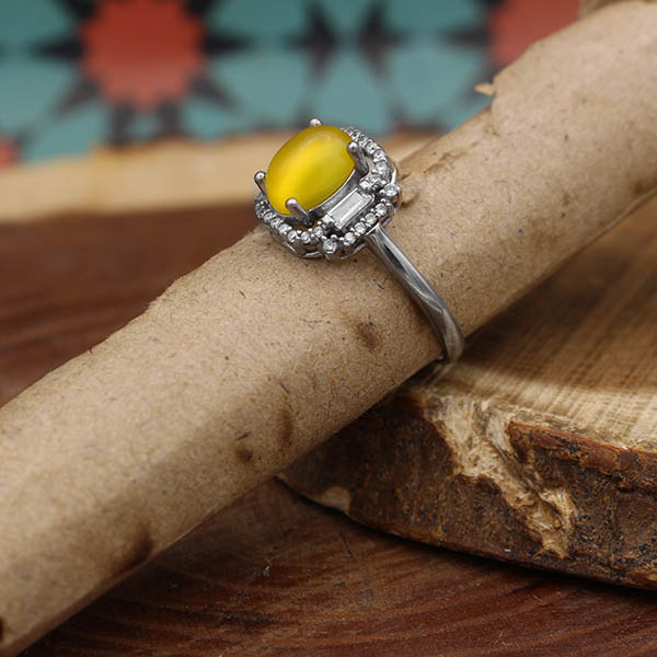 این انگشتر زنانه از نقره 925 ساخته شده که به‌دلیل آبکاری طلا سفید، همواره درخشان و زیبا خواهد ماند. نگین عقیق زرد اصل، در مرکز این انگشتر قرار گرفته و با دعای شرف الشمس، ارزش معنوی بالایی به آن بخشیده است (حکاکی ذکر پر فضیلت شرف شمس در پشت نگین با آداب معین و در زمان خاص). نگین‌های اتمی اطراف آن، جلوه‌ای چشمگیر به این اثر هنری داده‌اند. آبکاری طلا سفید از کدر شدن نقره جلوگیری کرده و باعث حفظ براقیت همیشگی آن شده است. قابلیت سایز شدن این انگشتر، باعث شده که به‌راحتی برای هر دستی مناسب باشد.